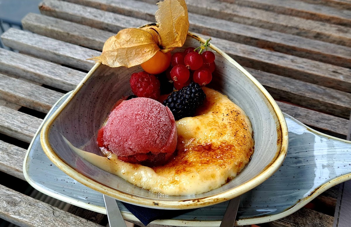 For dessert, Zimteis mit warmen Pflaumen is the way to go. This warm cinnamon ice cream, paired with juicy plums, is a perfect way to round off your meal. The creamy ice cream, infused with cinnamon, contrasts beautifully with the sweetness of the plums, creating a dessert that’s as comforting as it is indulgent.